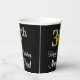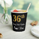 This elegant, sophisticated, and stylish birthday paper cup design features a large ordinal number “36th” having a faux/imitation gold-like appearance, plus the birthday greeting message “Happy 36th Birthday,” and a custom name in a script-style font. It also has a black-coloured background. Stylish birthday themed paper cups like this might be used at a party in celebration of somebody’s 36th birthday. [~Z0000538]