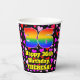 This joyful and fun birthday-themed paper cup design features a large number “36” with a rainbow spectrum gradient inspired pattern, along with the message “Happy 36th Birthday,”, and an editable name. The background features a pattern of pink, purple, and red heart shapes of various sizes. Joyful, happy paper cups like this might be fun to use at a birthday party being held in celebration of somebody’s thirty sixth birthday. [~Z0000548]
