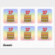 This joyful and fun birthday square sticker design features a cartoon-style depiction of a three-tier birthday cake having number-shaped candles on top showing the age “37“, along with the message “HAPPY 37TH BIRTHDAY,”, and an editable recipient name. The background features a multicolored pastel rainbow spectrum inspired gradient pattern. Stickers like these might be distributed or used at a party held for somebody who is celebrating their thirty seventh birthday, or perhaps used when wrapping gifts or preparing invitations for such an event. [~Z0000624]