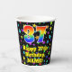 This fun and colourful birthday paper cup design features a large number “37” with a rainbow spectrum gradient inspired pattern, along with the message “Happy 37th Birthday,”, and a personalised name. The background features an exciting and colourful pattern featuring many star shapes with different colours and sizes. Colourful, vibrant paper cups like this might be fun to use at a birthday celebration/party being held in celebration of somebody’s thirty seventh birthday. [~Z0000540]