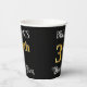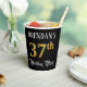 This elegant and ornate birthday paper cup design features an editable name and the message “37th Birthday Party”. The large number “37th” has a faux/imitation gold-inspired coloring pattern, and the words “Birthday Party” are in fancy script-style text. The background is colored black by default (although it can be customized). Luxurious, fancy paper cups like this might be useful at a birthday party being held in celebration of somebody’s 37th birthday. [~Z0000567]