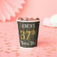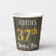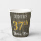 This fancy and opulent birthday themed paper cup design features a personalised name and the message “37th Birthday Party”. The large number “37th” has a faux/imitation gold-inspired colouring pattern, and the words “Birthday Party” are in elegant script-style text. The background features an imitation/faux woodgrain-inspired look. Luxurious, ornate paper cups like this might be used at a birthday celebration/party being held in celebration of somebody’s 37th birthday. [~Z0000568]