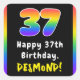 This bold and fun birthday themed square sticker design features a large number “37“ with a multicolored rainbow spectrum inspired gradient pattern, along with the message “Happy 37th Birthday,”, and a customisable recipient name. Vibrant birthday themed stickers like these might be used or given out at a birthday party in celebration of somebody’s 37th birthday, or perhaps used when preparing invitations or gifts for such an event. [~Z0000630]