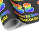 This cheerful, colourful, and fun birthday-themed wrapping paper design features a large number "38" and the message "HAPPY BIRTHDAY,", both coloured with a rainbow spectrum gradient inspired pattern, along with a bold yellow custom recipient name. The background is coloured black. Fun wrapping paper like this might be used when wrapping presents being given to somebody in celebration of their 38th birthday. [~Z0000475]