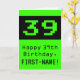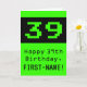 This fun and nerdy birthday themed greeting card design features a large green retro computer game style number "39" on the front. It also features the birthday greeting message "Happy 39th Birthday,", and a customisable name. The inside features a personalised birthday greeting message, or could perhaps be cleared and left blank if a message is to be written by hand instead. A silly and nerdy birthday greeting card like this might be used to send birthday wishes to somebody who is celebrating their thirty ninth birthday and who really likes video gaming. [~Z0000430]