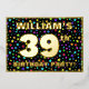 The front of this fun thirty-ninth birthday party foil invitation card design features a personalised name, a large number “39th”, the message “BIRTHDAY PARTY!”, and a border. The background of the front has an exciting, colourful pattern of stars. The back features personalised details about the event, such as the date, time, location, and any other information that may be relevant. Customisable invitations like these might be a fun way to invite guests to a birthday gathering being held to celebrate somebody’s 39th birthday. [~Z0000600]