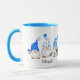 Holiday mug with 3 cute and funny Christmas gnomes wearing blue hats. Personalised with your monogram/name. Design one for each member of the family. Filled with cocoa, candy, or small treats, this will make a perfect gift for family members and friends. Choose your mug colour before ordering.