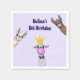 Personalised birthday paper napkins with a cute graphic illustration featuring 3 curious llamas. One llama is wearing a crown and blowing bubble gum. The other 2 are standing off to the side, with only their head and necks visible, peering over at you. Light purple background.