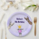 Personalised birthday paper plates with a cute graphic illustration featuring 3 curious llamas. One llama is wearing a crown and blowing bubble gum. The other 2 are standing off to the side, with only their head and necks visible, peering over at you. Light purple watercolor background.