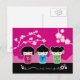Three cute japanese dolls (kokeshi), on a pink background with cherry flowers