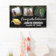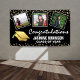 A graduation banner which allows you to upload 3 pictures of the graduate, gold sparkle decoration on a black background, gold graduation cap and a modern template that is easy to customise.