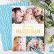 “Happy Hanukkah.” Fun, playful, whimsical handcrafted real gold foil typography and a random Star of David pattern overlay a clean, white background. Add 3 photos of your choice to help usher in Hanukkah with this stunning, colourful, personalised real gold foil greeting card. Hand drawn white lines overlay a light turquoise blue background on the back. Feel the warmth and joy of the holiday season whenever you send this festive greeting. Your choice of real gold, silver, or rose gold foil. Matching stickers, pillows, wrapping paper, serving trays, home décor, and more are also available. Make this Hanukkah one to remember!