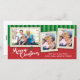 This Christmas photo card features three customisable photo frames accented with a border to look like it is a framed photo. The background is a vertical stripe pattern using greens and red. The bottom portion is a solid red and features script hand lettering reading: Merry Christmas. This card is perfect for a family with children because one photo frame is larger for a family group and the other two frame are smaller for a photo of one person.