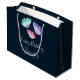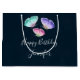 A personalised happy birthday gift bag (large size) with a pretty design. 3 watercolor butterflies, painted pink, purple and green. Dark blue watercolor background.