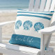 “Beach life”. Whenever you relax on this seaside throw pillow, you can be rest assured the summer seashore fun will continue. Three graphic, teal blue vintage seashells overlay a crisp, white background with nautical teal blue stripes. Both indoor and outdoor fabric choices available. Great for the family beach house, your coastal lifestyle, or just to bring a bit of the beach into your home all year round!