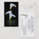 A composite photograph of a single white arum or calla lily, zantedeschia, repeated, on a customisable black background, with a template for company name, address and other information. This business card template is shown on platinum metallic card stock, which can be easily changed. Suitable for mortuary services or bereavement counseling