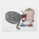 3D glasses with a movie reel, popcorn and soft drink.