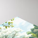 a magnificent tree in full bloom, its white blossoms radiating against a backdrop of lush greenery and a tranquil lake. The tree stands majestically on a small promontory, its reflection mirrored perfectly in the still water, creating a sense of depth and symmetry. The surrounding landscape is a tapestry of verdant hues, with hints of pink and yellow blossoms adding subtle pops of colour. The sky above is a soft, hazy blue, suggesting a calm, sunny day. The overall scene exudes a serene and peaceful ambiance, capturing the essence of springtime's gentle beauty and the harmonious balance of nature.