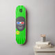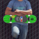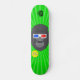 A skateboard that has a cartoon style gorilla wearing 3d glasses with a green background.