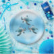 Elegant painted 3D sea turtles on an blue bokeh ocean background. Modern coastal design with sea turtles navigating through a tranquil sea.