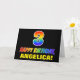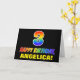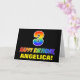 The front of this colourful, cheerful, and fun birthday themed greeting card design features a large number "3" and the message "HAPPY BIRTHDAY,", both coloured with a rainbow spectrum gradient inspired pattern, along with a bold yellow custom recipient name. The front also has a plain black coloured background. The inside features a custom birthday greeting message, or could perhaps be cleared and left blank if a message is to be written by hand instead. A cheerful customisable birthday card like this might be a fun way to acknowledge somebody’s third birthday. [~Z0000472]