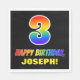 This cheerful, fun, and colourful birthday paper napkin design features a large number "3" and the message "HAPPY BIRTHDAY,", both having a rainbow spectrum gradient inspired pattern colouring, along with a bold yellow custom recipient name. The background is coloured black. Birthday themed paper napkins like this might be fun to use at a party being held to celebrate somebody’s 3rd birthday. [~Z0000476]