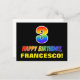 The front of this colourful, cheerful, and fun birthday themed postcard design features a large number "3" and the message "HAPPY BIRTHDAY,", both coloured with a rainbow spectrum gradient inspired pattern, along with a bold yellow editable recipient name. The front also features a simple black coloured background. The back of the postcard has a customisable birthday greeting message, or could perhaps be cleared and left blank if a message is to be written by hand instead. An exciting customisable birthday postcard like this might be a fun way of acknowledging somebody’s third birthday. [~Z0000474]