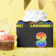 This colourful, cheerful, and fun birthday-themed wrapping paper design features a large number "3" and the message "HAPPY BIRTHDAY,", both coloured with a rainbow spectrum gradient inspired pattern, along with a bold yellow editable recipient name. The background is coloured black. Fun wrapping paper like this may be used when wrapping a birthday present or gift being given to somebody who is celebrating their 3rd birthday. [~Z0000475]