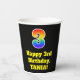 This colourful and fun birthday paper cup design features a large number “3” having a rainbow spectrum gradient inspired pattern. It also features the message “Happy 3rd Birthday,”, and a customisable name. The background is coloured black. Colourful, vibrant paper cups like this might be fun to use at a birthday party being held to celebrate somebody’s third birthday. [~Z0000537]