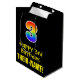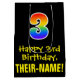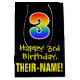 This exciting, fun, and colourful birthday-themed gift bag design features a large number "3" with a rainbow spectrum gradient inspired pattern, along with the message "Happy 3rd Birthday,", and a personalised recipient name. It also has a black-coloured background. A gift bag like this might be used when giving a gift or present in honour of somebody’s 3rd birthday. [~Z0000512]