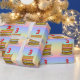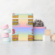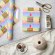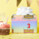 This colourful and cheerful birthday wrapping paper design features a cartoon-style depiction of a three-tier birthday cake having a numeral-shaped candle on top showing the number “3“, along with the message “HAPPY 3RD BIRTHDAY,”, and a personalised recipient name. The background has a multi-colour pastel rainbow spectrum inspired gradient pattern. Upbeat birthday themed wrapping paper like this might be a fun way to wrap a gift or present being given to celebrate somebody’s third birthday. [~Z0000622]