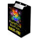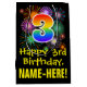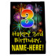 This exciting, colourful, and fun birthday gift bag design features a large number "3" with a rainbow spectrum gradient inspired pattern, along with the message "Happy 3rd Birthday,", and a custom recipient name. It also has a colourful background pattern inspired by the appearance of bursting celebratory fireworks. A gift bag like this might be a fun way of wrapping a birthday present or gift being given to somebody who is celebrating their 3rd birthday. [~Z0000509]