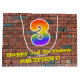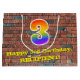 This vibrant and colourful birthday gift bag design, inspired by street art, features a large number "3" with a rainbow spectrum gradient inspired pattern, along with the message "Happy 3rd Birthday,", and a personalised name. The background features a brick wall style pattern. A fun birthday themed gift-bag like this might be used when giving a gift or present in celebration of somebody’s third birthday. [~Z0000522]