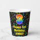 This cheerful and fun music themed birthday paper cup design features a large number “3” having a rainbow spectrum gradient inspired pattern. It also features the message “Happy 3rd Birthday,”, and an editable name. The background features an exciting and colourful pattern having music notes and symbols of various colours and sizes. Vibrant, colourful paper cups like this might be fun to use at a birthday celebration being held to celebrate somebody’s third birthday. [~Z0000541]