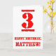 This fun birthday-themed greeting card design features a large red number “3” having a rubber stamp inspired look, along with the birthday greeting message “HAPPY BIRTHDAY,” and a customisable name on the front. The inside has an editable birthday greeting message, or could perhaps be cleared and left blank if a message is to be written by hand instead. A fun customised birthday greeting card like this might be used to celebrate somebody’s third birthday. [~Z0000524]