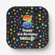 This joyful and fun birthday themed paper plate design features a large number “3” with a rainbow spectrum gradient inspired pattern, along with the message “Happy 3rd Birthday,”, and a custom name. The background features an exciting and colourful pattern inspired by a field of stars. Vibrant paper plates like this might be used when hosting a birthday party for somebody in celebration of their third birthday. [~Z0000582]