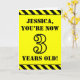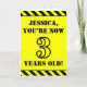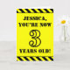 The front of this fun and attention-grabbing birthday-themed greeting card design features a personalised name and the message "YOU’RE NOW 3 YEARS OLD!" in black stencil style text on a yellow coloured background. The front also features an eye-catching yellow and black stripes pattern at the top and bottom edges. The inside features a custom birthday greeting message, or could perhaps be cleared and left blank if a message is to be written by hand instead. A custom birthday card like this might be a fun way to send birthday wishes to somebody who is celebrating their third birthday. [~Z0000413]