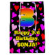 This joyful and fun birthday giftbag design features a large number “3” with a rainbow spectrum gradient inspired pattern, along with the message “Happy 3rd Birthday,”, and an editable name. The background features a pattern of red, purple, and pink heart shapes. A loving gift bag like this might be used when giving a gift or present in honour of somebody’s 3rd birthday. [~Z0000551]
