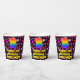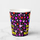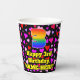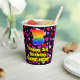 This colourful and fun birthday-themed paper cup design features a large number “3” with a rainbow spectrum gradient inspired pattern, along with the message “Happy 3rd Birthday,”, and a personalised name. The background features a pattern of heart shapes with colours like pink, red, and purple. Loving, happy paper cups like this might be fun to use at a birthday celebration being held to celebrate somebody’s third birthday. [~Z0000548]