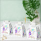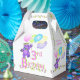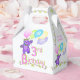3rd birthday party custom name gable favour box featuring a cuddly and cute purple teddy bear princess dressed up in a lovely yellow jewelled crown and pink, blue and green flower accessories holding a bunch of balloons with the word PARTY on them. Personalising with child's name makes it extra special. It's a fun royal theme for a special princess. Original design by Anura Design Studio.