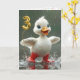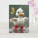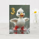A cheerful white duckling wearing red rain boots splashes joyfully in puddles while holding a shiny gold "3" balloon.
