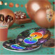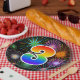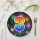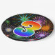 This fun, cheerful, and colourful paper plate design features a large number "3" having a rainbow spectrum gradient inspired pattern colouring. It also features a vibrant and exciting bursting celebratory fireworks inspired pattern. It has a black coloured background. Fun paper plates like this might be used at a celebration being held in honour of somebody’s third birthday, a third anniversary, or some other 3rd event. [~Z0000490]