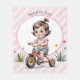 Adorable illustration of a little girl riding a red tricycle, surrounded by colourful balloons and flowers, perfect for celebrating a 3rd birthday party. Sweet pastel colours and playful details make this design ideal for invitations, party décor, and keepsakes for a little girl’s special day.