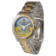 Very good quality watch that looks good whether dressing up or down. The band is sturdy. The watch is rather large so might not work for smaller folks. Recommended as a good gift. Printing is just a touch light but adds a nice touch of personalization.