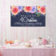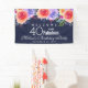 Birthday welcome banner with a pretty bouquet of watercolor roses and other colourful sprigs, leaves and branches stretching across the top of the banner. Set on a navy blue background. Text says: 40 and fabulous, thank you for coming, along with your personalised event info.