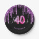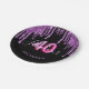 A trendy and glamourous 40th birthday party paper plate. A classic black background decorated with dark purple coloured faux glitter drips, paint dripping look. With the text: 40 and fabulous. Personalise and add a name. Purple and hot pink coloured text. The word Fabulous is written with a modern hand lettered style script. Age 40 is written with a balloon style script.