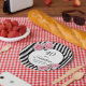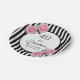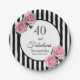 A paper plate for an elegant 40th birthday party. Classic slim black and white vertical stripes as background. With girly and feminine pink roses as decoration.