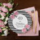 A paper plate for an elegant 40th birthday party. Classic slim black and white horizontal stripes as background. With girly and feminine pink roses as decoration.