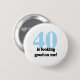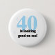 40 is Looking Good on Me T-shirts, mugs, buttons, cards, and other 40th birthday apparel and gift items with blue and black text design with tiny balloons.