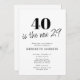 40 is the New 29 Black on White 40th Birthday Party Invitation... Our minimalist black and white 40th Birthday invitation features the number 40 in dramatic black followed by "is the new 29" in a playful handwritten font. Below this is your invitation text in black serif and italic typography. All text (except for the "40" text graphic) can be easily revised with your own details on the personalisation template. This invitation is also available as an editable instant download.